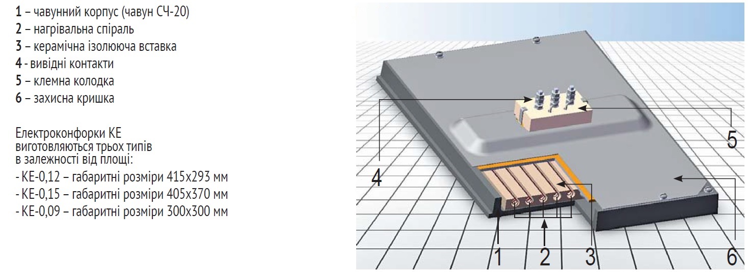 КЭ — конфорка электрическая — нагреватель, состоящий из чугунного корпуса, внутри которого размещены два нагревательные элементы (спирали из проволоки сопротивления), вставленные в керамические изолирующие вставки особой конструкции. Также в качестве нагревательных элементов могут быть использованы трубчатые электронагреватели (ТЭНы). В этом случае электроконфорки КЭ имеют большую тепловую эффективность и надежность. С нижней стороны чугунного корпуса есть защитная крышка, сквозь которую через керамические изоляторы выведены контакты нагревательных элементов. Защитная крышка является съемной, что позволяет ремонтировать электроконфорки в случае перегорания нагревательных элементов, которые можно приобрести отдельно, в виде ремонтного комплекта.
